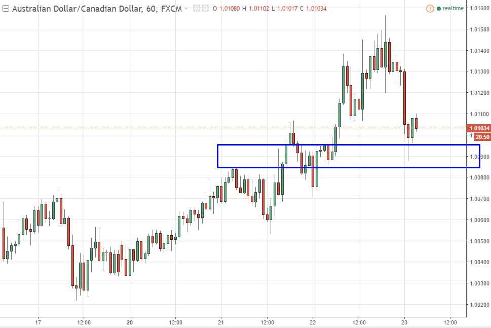 The pair has been trending quite nicely as of late, as the gold markets have been much more stable and bullish than oil. (In general.) The oil markets are facing serious resistance, so it makes a lot of sense that the gold currency – AUD – would continue to outperform the oil currency – the CAD. What you don’t see on this one hour chart is that the area just below has a lot of support on the daily charts as well.