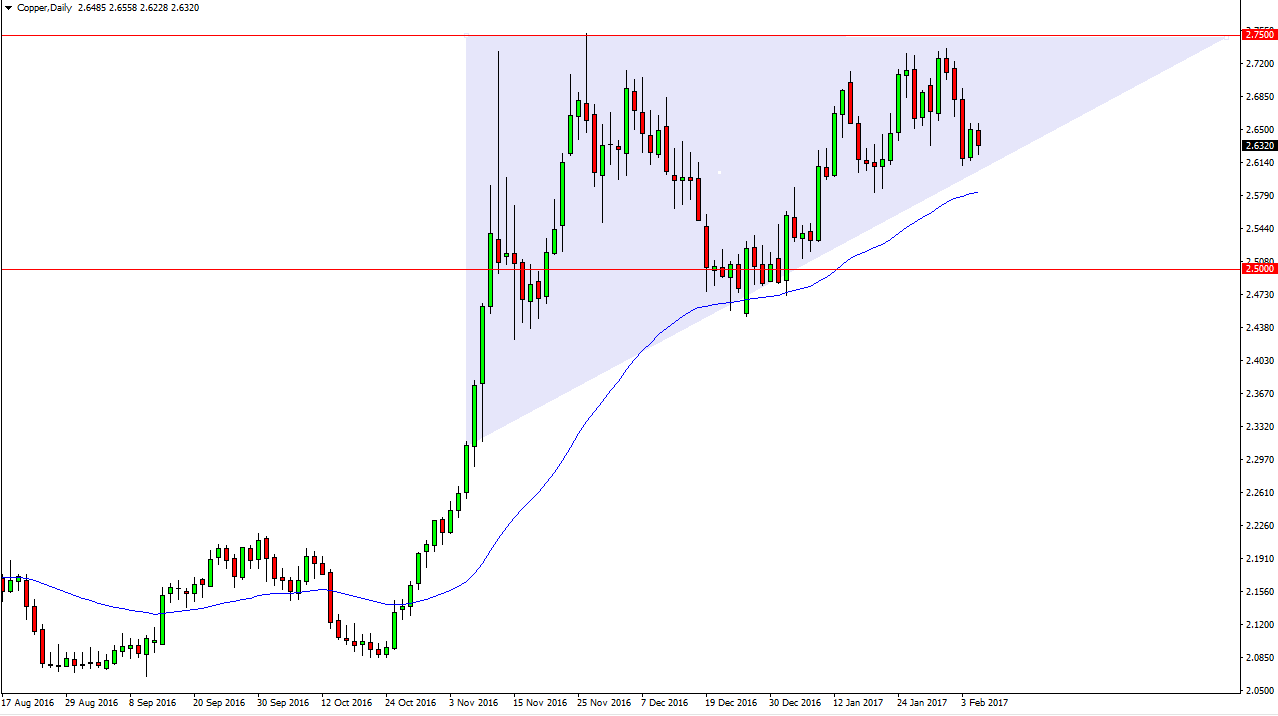 That’s not to say that the resistance will be broken easily, and I believe that the $2.75 level is crucial. However, I think we will eventually break above there and when we do we should continue to go much higher. The breaking of that level should send this market to the $3 handle and beyond. The reason I think this chart is ready to go higher is based upon talk of infrastructure spending in the United States, and possibly in other parts of the world. Pay attention to talk of construction in China, because that’s always a major driver of the copper market as well.