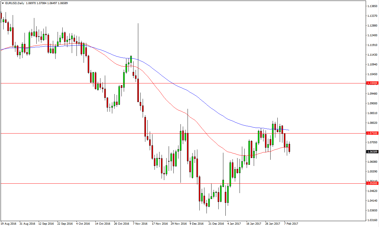 The EUR fell a bit during the day on Thursday, breaking below the 50-day exponential moving average. The hammer that formed on Wednesday shows signs of support, so if we can break down below the bottom of the candle I think that the market continues to drop towards the 1.05 level below where there is massive support. I see significant resistance above the 100-day exponential moving average as well, as the 1.0750 level looks resistive. I think currently that it’s probably more likely to see bearish pressure in this market due to concerns about the French elections, so I have no interest in buying, at least not into we break above to a fresh, new high.