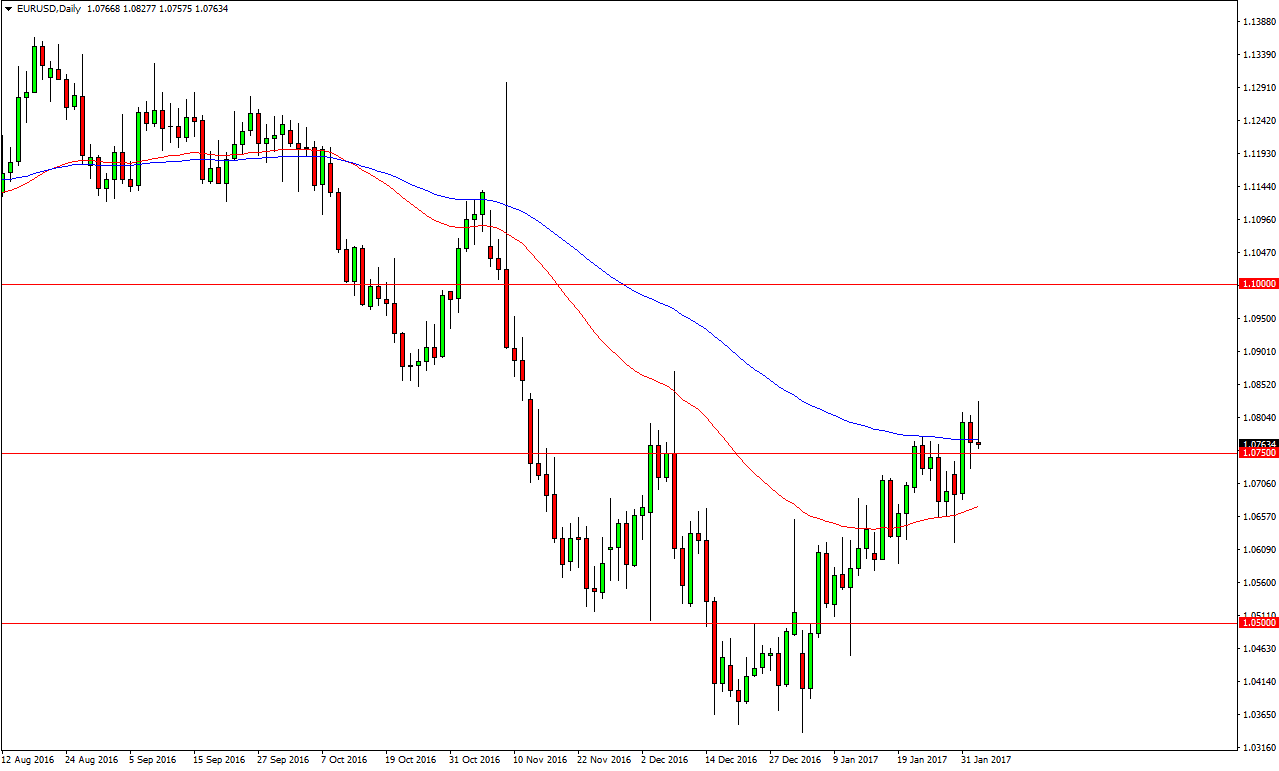 During the Thursday session, the EUR/USD pair rallied initially during the day but turned around to form an exhausted looking candle. Because of this, it looks like the market is a little bit skittish ahead of the jobs number tomorrow, but I still see a significant amount of support underneath, and if we can break above the top of the shooting star for the day on Thursday, that’s a very bullish sign and should continue to push this market to the upside. Even if we pull back from here, I believe is not until we breakdown below the 50-day exponential moving average that we can start selling. With this, it’s a very likely that the market will continue to see quite a bit of choppiness at of the jobs number.
