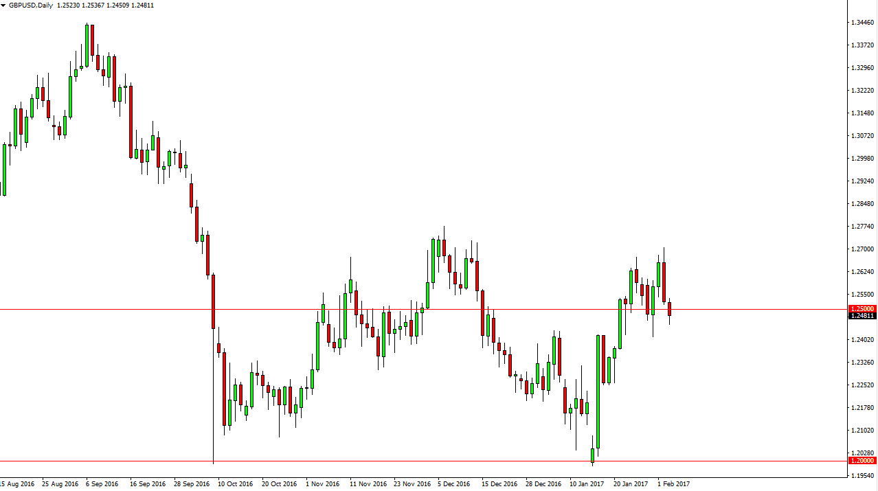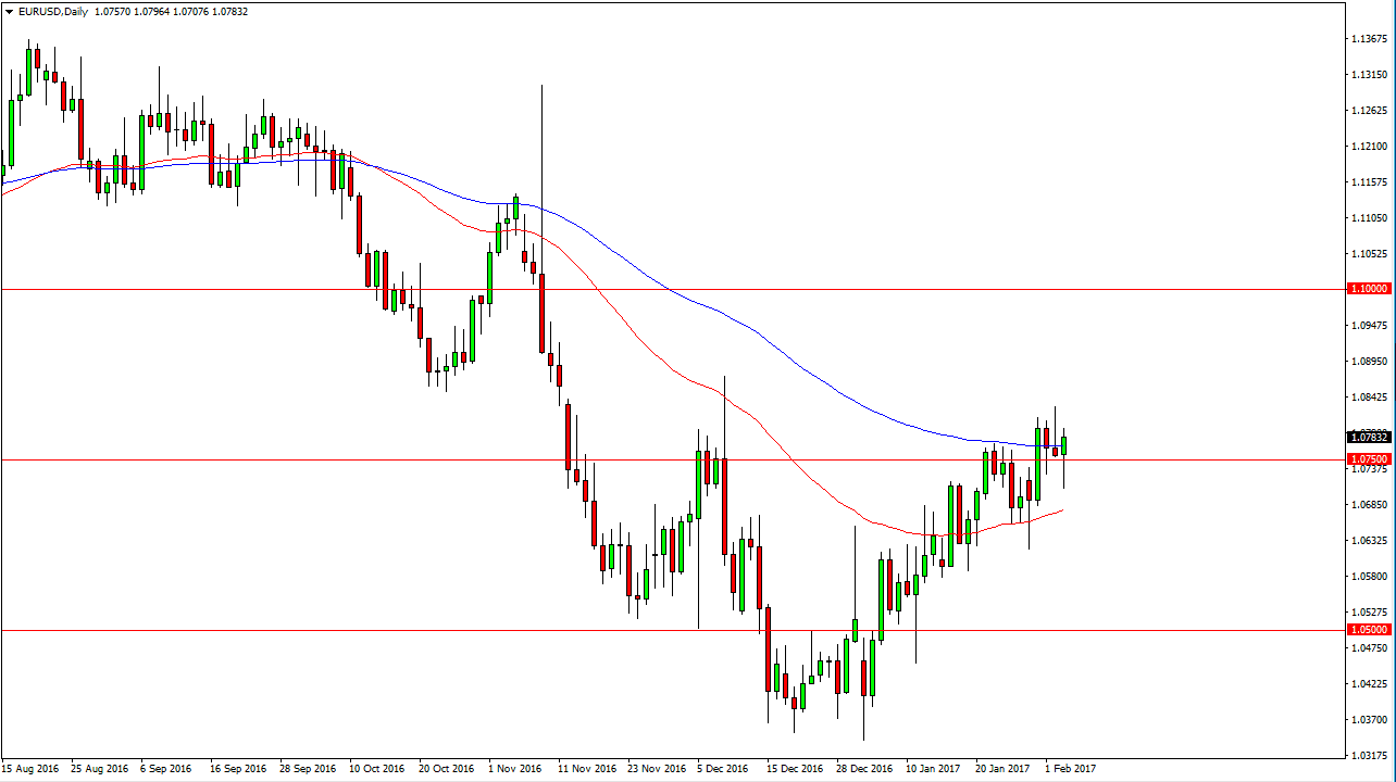The EUR/USD pair initially fell during the day on Friday, but turned around to form a hammer. The 1.0750 level continues to offer support, and with the hammer that were formed during the day, looks as if the EUR is and quite ready to give up the uptrend. The shooting star from the Thursday session of course suggests that were going to have issues but I also recognize that the hammer is formed not only on support, but the 100-day exponential moving average. A break above the top of the shooting star should send this market to the 1.09 handle, and then eventually the 1.10 level after that. Alternately, if we breakdown below the 50-day exponential moving average, pictured in red, it could be a nice selling opportunity back down to the 1.06 level, perhaps even the 1.05 handle. No matter what happens, expect a lot of volatility.
