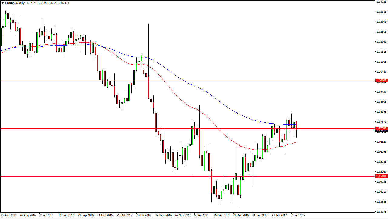 The EUR/USD pair had a negative session on Monday, but continues to find support just below at the 50-day exponential moving average, or at least just above it. The 100-day exponential moving average was broken initially during the day, but continues to offer a bit of resistance. The 1.075 level looks like a bit of a magnet when it comes to this pair, and with this in mind I believe that we will continue to chop around in a short-term type of trading environment. Because of this, I’m going to avoid the pair, but I think once we break above the Thursday shooting star, or break below the 50-day exponential moving average, clarity will return to the market and I will be able to follow either signal.