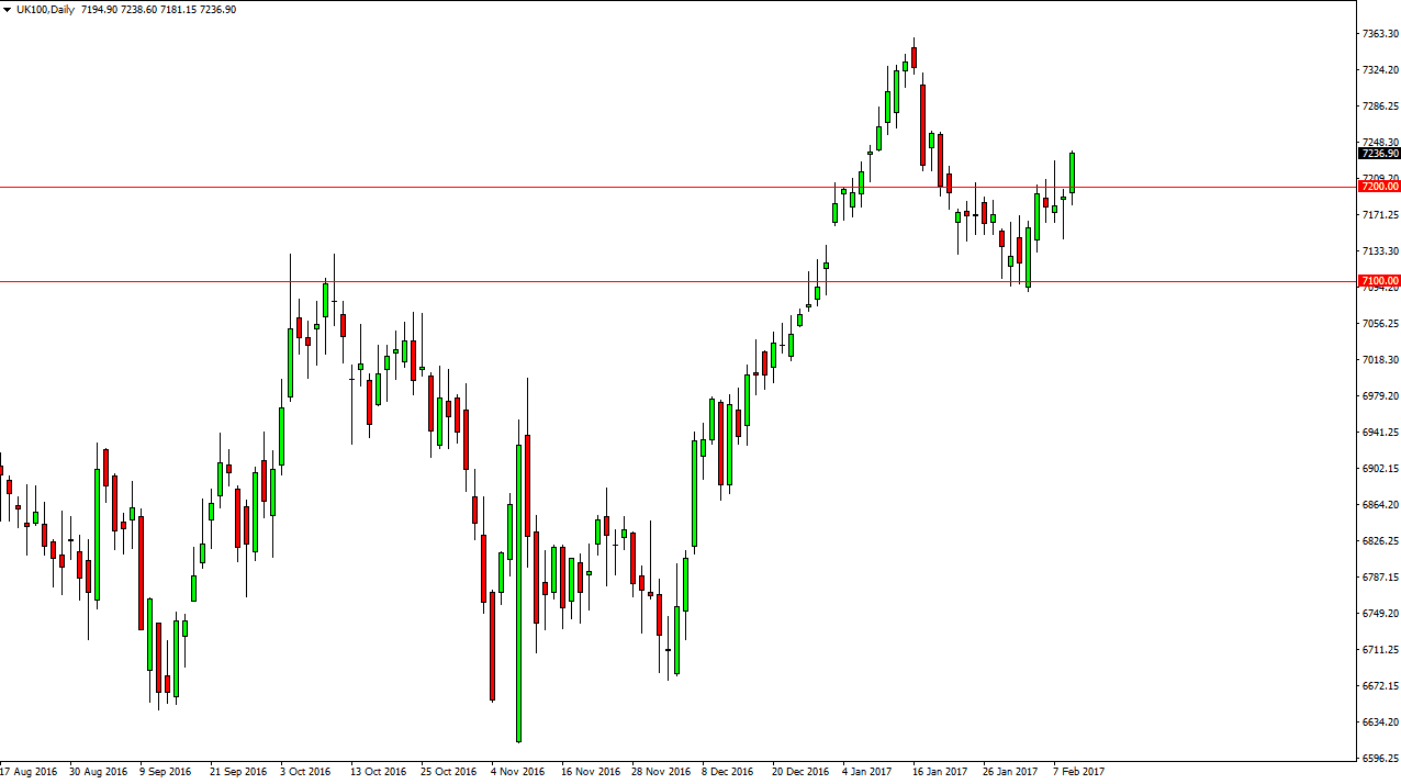 The FTSE 100 initially fell during the day on Thursday, but found enough support below to turn things around and break much higher. The hammer from the Wednesday session of course is very bullish, and the shooting star from the Tuesday session was very negative. The fact that we cracked above that suggests that buyers are in control yet again, and it cannot be overlooked that this formed at the previous gap. Because of this, I believe that the FTSE 100 continues to grind much higher, and of course we been in a longer-term uptrend anyway.