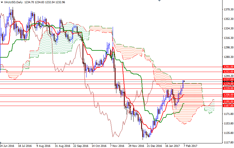 Yesterday’s advance pushed prices above the Ichimoku clouds on the daily time frame, which is a positive sign. The market is currently trading above the daily and 4-hourly charts. We have positively aligned Tenkan-Sen (nine-period moving average, red line) and Kijun-Sen (twenty six-period moving average, green line) lines on both charts. The bulls have to convincingly push prices beyond 1237 so that they can challenge the bears waiting at around 1242.50. If the bulls pass through 1242.50, then 1247/6 and 1252 could be the next possible targets.