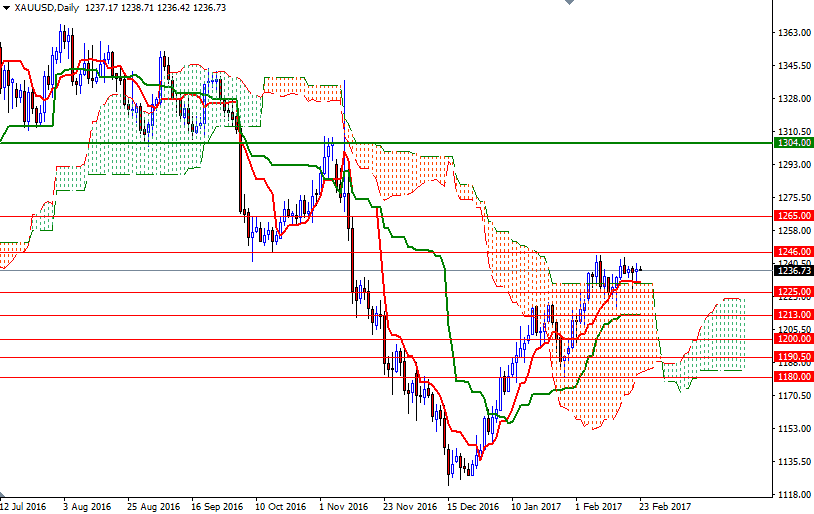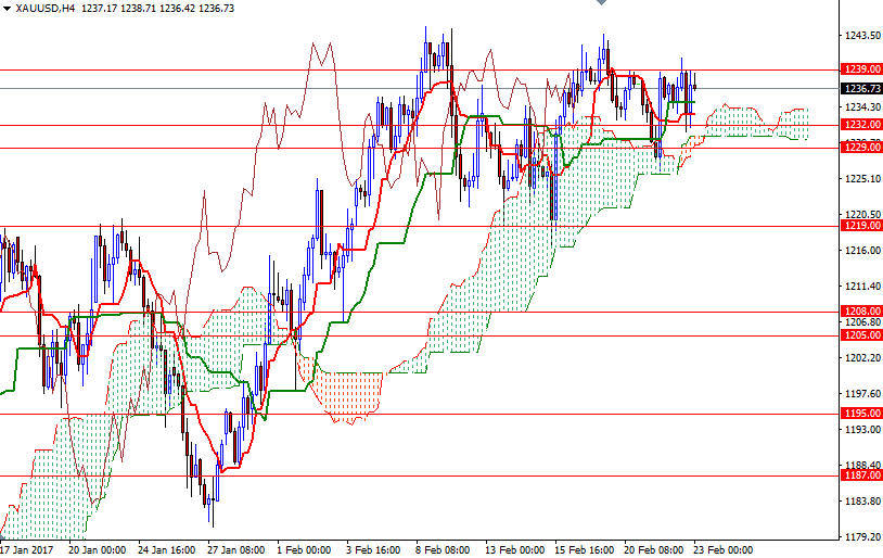 The key levels remains unchanged, as the market continues to consolidate between the 1239 level on the top and the 1232 level on the bottom. The short-term technical charts remain bullish, with the market trading above the daily and the 4-hourly Ichimoku clouds. If XAU/USD convincingly breaks through 1239, we might see a bullish attempt targeting the 1247/6 region. The bulls have to capture this strategic camp in order to gain momentum and challenge the bears on the 1252 battlefield.
