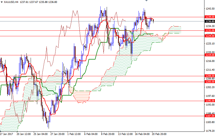 The market is trading above the daily and the 4-hourly Ichimoku clouds and we have positively aligned Tenkan-Sen (nine-period moving average, red line) - Kijun-Sen (twenty six-period moving average, green line) crosses. Despite positive short-term outlook, flat Tenkan-sen and Kijun-sen indicate there is a lack of momentum. Unless prices break up above 1239, the market will have a tendency to return to the daily cloud - in other words, the support in the 1232/29 will be tested. The bears will need to capture this strategic camp so that they can increase pressure and drag the market towards 1225. If XAU/USD falls through 1225, then 1220/19 will be the next target.