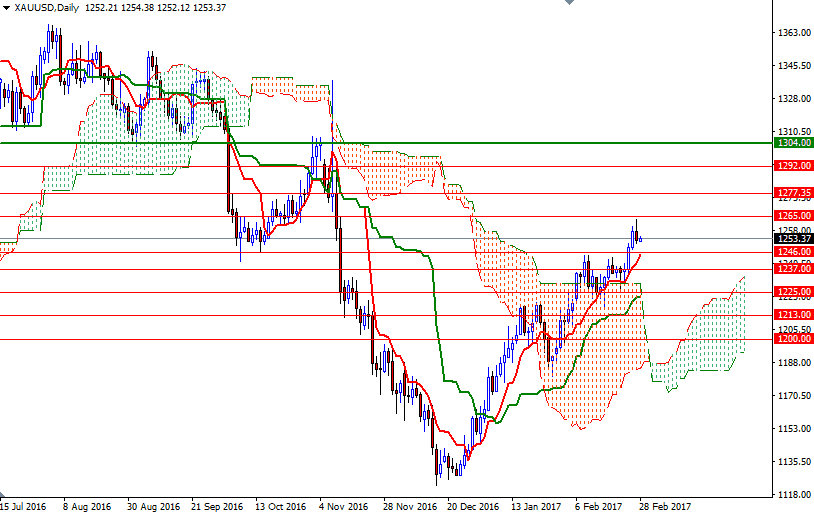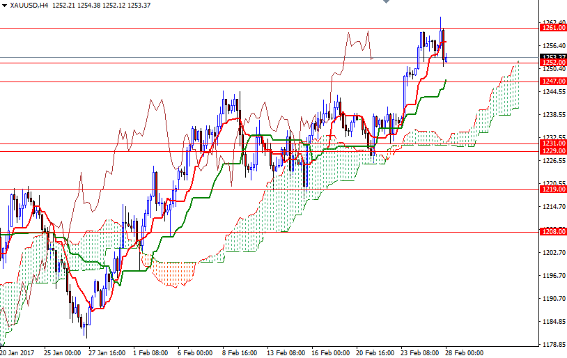 Gold prices fell $4.79 on Monday, ending a three-day streak of gains, as investors awaited comments from President Donald Trump on Tuesday that could shed some light on his economic plans. Although gold started the week with a bullish tone and tried pass through the 1265/1 area, which I had identified as a key to higher levels, after U.S. housing data came in weaker than expected, the initial rally faded as buying dried up. As a result, prices reversed and returned to the 1252/0 area.