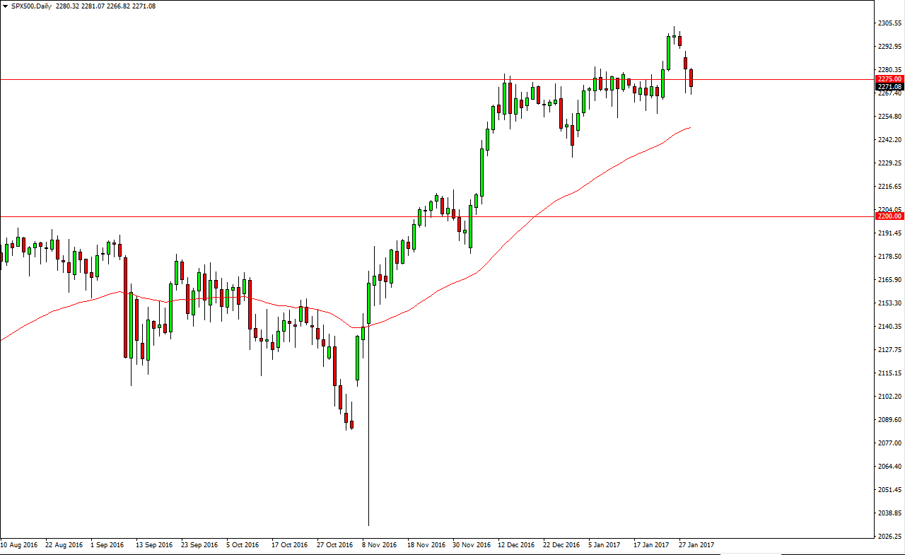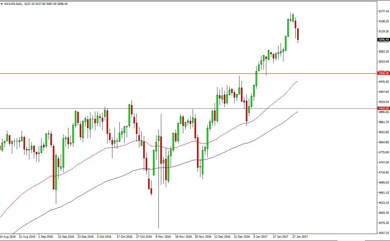 The NASDAQ 100 fell during the day on Tuesday, breaking the bottom of a hammer from Monday. While this is a very negative sign, I see a lot of support at the 5050 level, and of course at the 5000 level underneath their which should be the “floor” in the market. I believe that a supportive candle is a buying opportunity, and should continue to give people who may have missed the surge higher an opportunity to get involved.