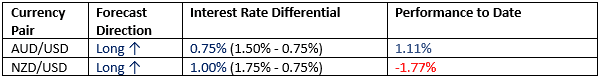 This month we forecasted that the highest-probability trades will be long AUD/USD and NZD/USD. The results so far are as follows: