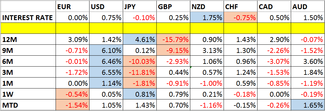 Let’s take a look at the relevant data of currency price changes and interest rates to date, which we compiled using a trade-weighted index of the major global currencies: