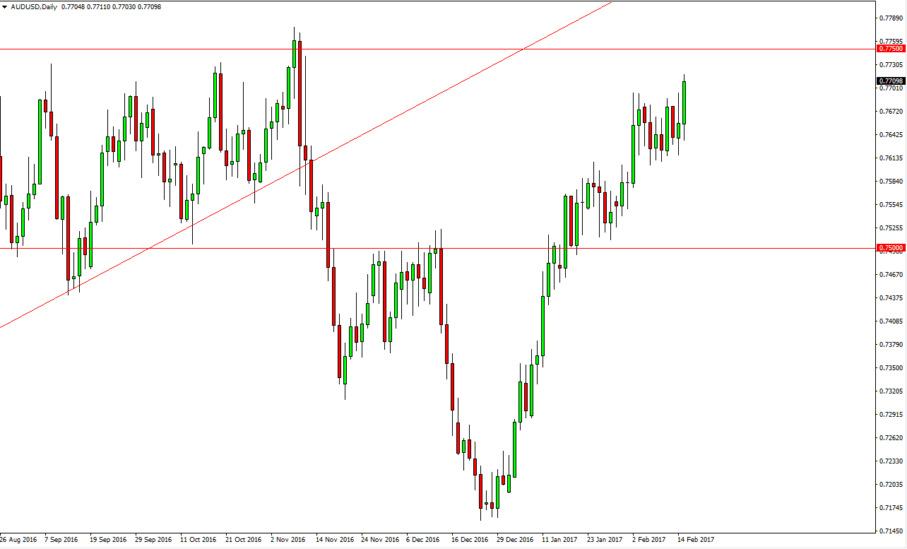 The AUD/USD pair initially fell on Tuesday, but turned around to make a large moved to the upside. We broke above the 0.77 level during the day, and that’s a very positive sign. I believe that we will reach towards the 0.7750 level above, which should be resistive. With the strength of the candle, it suggests that we are going to continue to show the Australian dollar going higher. I believe that the 0.76 level underneath should be supportive, and I believe that pullbacks will offer buying opportunities.