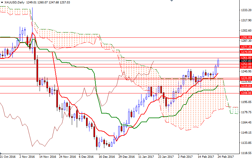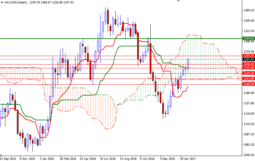 The latest data from the Commodity Futures Trading Commission (CFTC) revealed that speculative traders on the Chicago Mercantile Exchange increased their net-long positions in gold to 123763 contracts, from 109752 a week earlier. The XAU/USD pair is trading above the Ichimoku clouds on the daily and the 4-hourly charts. We have positively aligned Tenkan-Sen (nine-period moving average, red line) and Kijun-Sen (twenty six-period moving average, green line) lines on both charts, along with Chikou Span/Price crosses in the same direction. For quite some time I have been repeating that the short-term technical picture for gold remained positive and an upswing to the 1252 level (even an extension to the 1270/65 area) was possible. Since we have approached this are, I would I advise a bit of caution. Also note that XAU/USD is somewhere in the middle of the weekly Ichimoku cloud.