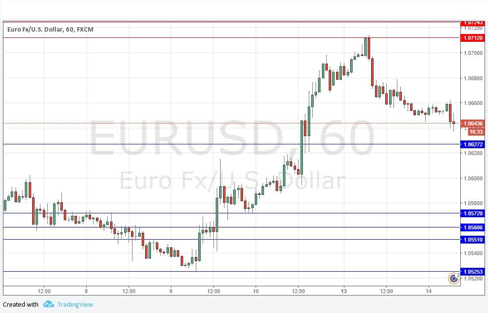Yesterday’s signals gave a profitable short trade just after the London open following a bearish outside candle rejecting the resistance level identified at 1.0712. At the time of writing it looks as if the price will continue to fall, so it is probably a good idea to stay in the trade if possible.