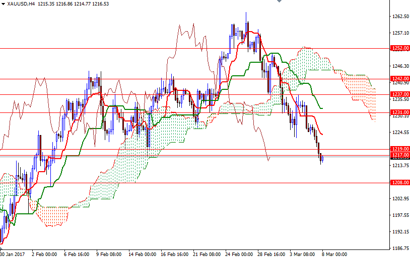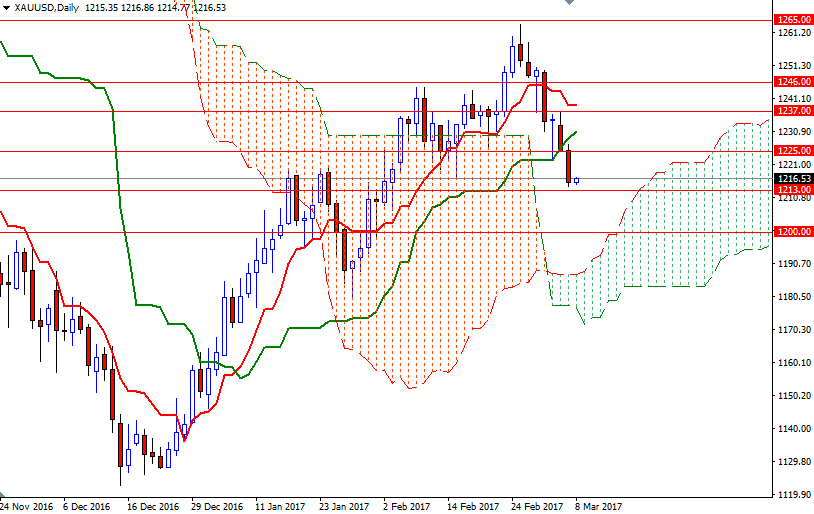 Gold prices closed at their lowest level since February 2 on anticipation of tighter U.S. monetary policy and as the dollar strengthened against other currencies. The XAU/USD pair slumped to $1214.10 an ounce before recovering slightly to the $1216.53 level. Technical selling was also behind gold's 0.81% drop on Tuesday. Not surprisingly, dropping below the $1222.88 level dragged prices towards the $1213/1 area.