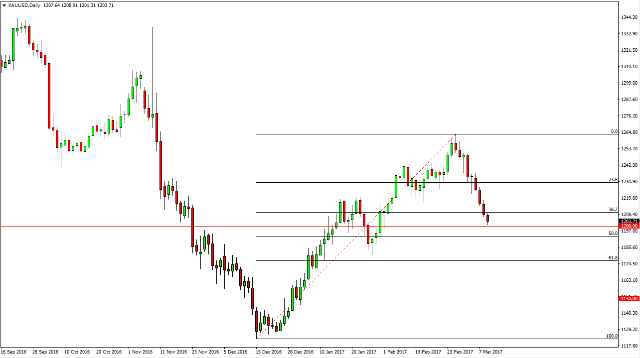 Gold markets fell initially during the day on Thursday, testing the $1200 level. This is an area that I think will offer quite a bit of interest though, mainly because of the psychological significance. However, I do recognize that the 50-day exponential moving average is just below, and because of this am waiting to see whether we can get some type of bounce to start buying again. A break above the top of the candle will be a buying opportunity, and I will not hesitate to go long. I will of course pay attention to the volatility, and must give stops a bit of room to move.