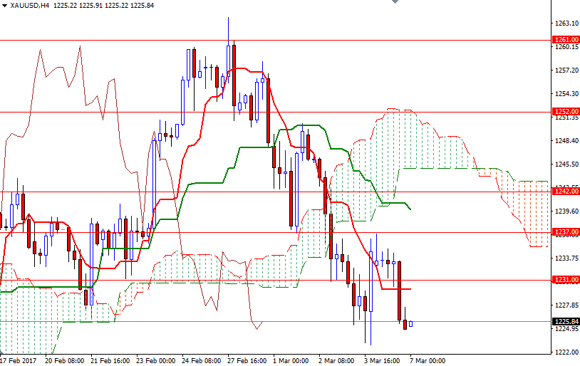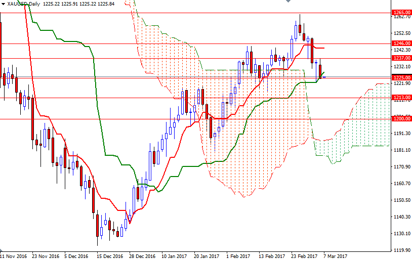 If the bulls fail to defend their camp at 1225 and price drop below the bottom of last week's low of 1222.88, then the market will probably visit the 1219/7 region. A break below there could send prices back to 1213/1 area where the bottom of weekly cloud also stands. Closing below 1211 on a daily basis would imply that the 1208/5 zone will be the next stop. Currently the initial resistance sits in the 1233.50-1231 region occupied by the Ichimoku cloud on the H1 chart. If prices break and manage to hold above that barrier, we could see XAU/USD extending its gains and proceeding to the 1238/7 area. Beyond that, the 1246/2 zone stands out as an obvious key resistance.