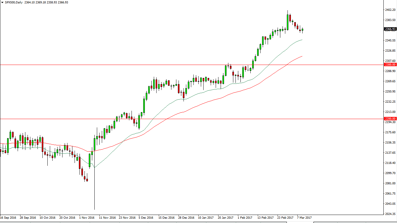 The S&P 500 was quiet during the session on Thursday as one would expect, due to the jobs number coming out today. Simply put, I think that if the jobs number is strong, this market continues to go higher. However, I wouldn’t mind seeing a bit of a pullback as it could offer value at lower levels. I think that the green exponential moving average on the chart, which is the 20-day exponential moving average, continues to provide dynamic support. I have no interest in selling either way, and I believe that the absolute “floor” in the market is down at the 2300 level. This means that I refuse to sell this market until we get below that level, something that doesn’t look very likely.