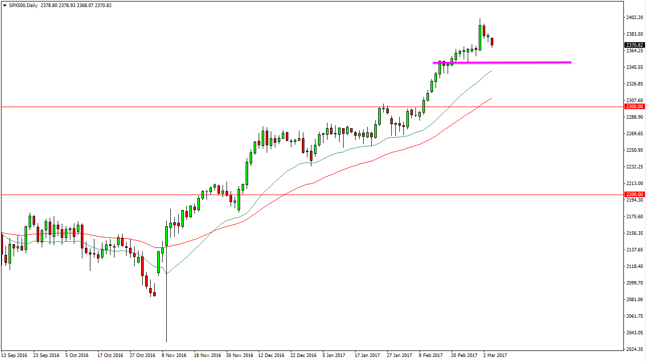 The S&P 500 fell slightly during the day on Monday, as we are bit overextended. The green 20-day exponential moving average continues to be supportive, so I think we will see a bit of a convergence near the 2350 handle that should be supportive due to recent price action and of course the moving average once it gets there. Because of this I believe that we will continue to grind sideways with a slightly negative bias and the short-term, but longer-term the market should continue to be very strong and I believe that the market will reach towards the 2400 level, and then eventually the 2500 level after that. I have no interest in selling this market as the S&P 500 has been so bullish.