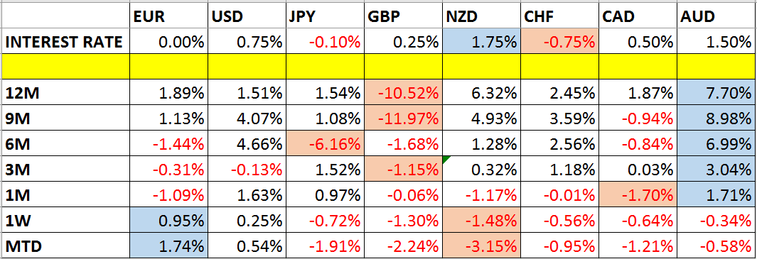 Let’s take a look at the relevant data of currency price changes and interest rates to date, which we compiled using a trade-weighted index of the major global currencies: