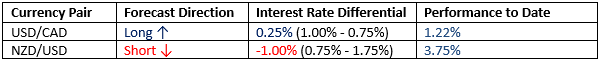 This month we forecasted that the highest-probability trades will be long USD/CAD and short NZD/USD. The performance so far is as follows: