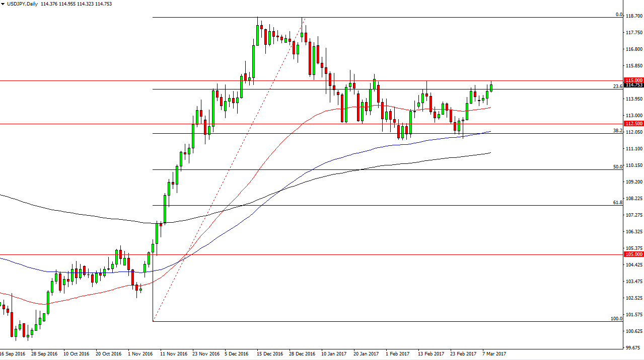 The USD/JPY pair rallied during the day on Thursday, slamming into the 115 handle. I believe that this market will eventually break out, and this could be the session it happens due to the jobs number. With this being the case, I would be very bullish of this pair and I think we should then reach towards the 118.50 level. Pullbacks at this point should be buying opportunities, and thus I look at it is a one-way market. The most recent low has been higher, so I think that we are building up the momentum to finally break out. I have no interest in selling this pair, and believe that we should continue to see quite a bit of bullish pressure over the longer term.