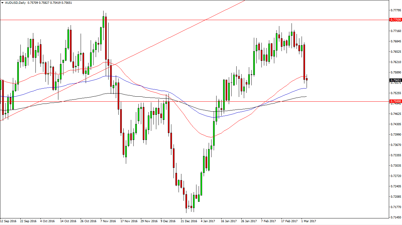 On the bounce, I believe that the market will reach towards the 0.7650 level above, which should be resistive, and thus I think that the bounce would be somewhat short-lived. This is a market that continues to be volatile, but I believe it’s only a matter of time before the market makes its intentions much clearer.