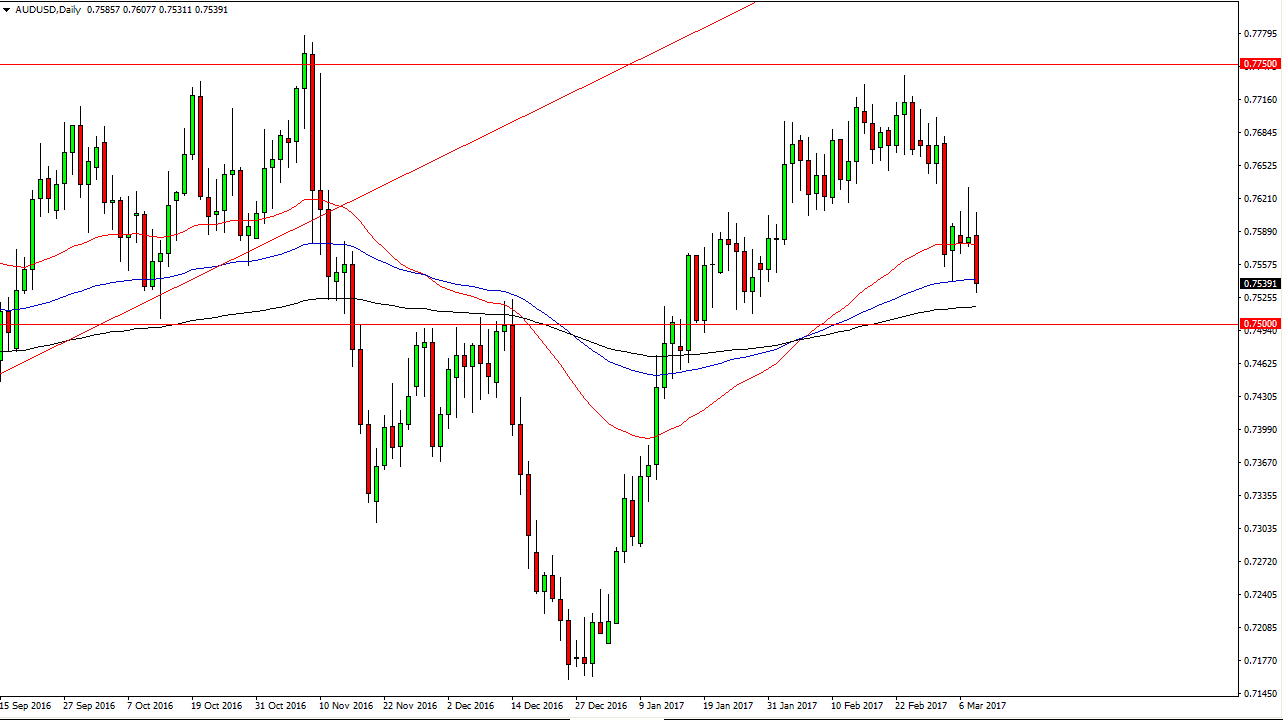 The Australian dollar is highly influenced by gold, which seems to be trying to find support below at the $1200 level. If it bounces, the Aussie should bounce as well. If we do breakdown below the 0.75 handle, I think that there is a lot of noise all the way to at least the 0.74 level. A breakdown below there would be extraordinarily negative in this market.