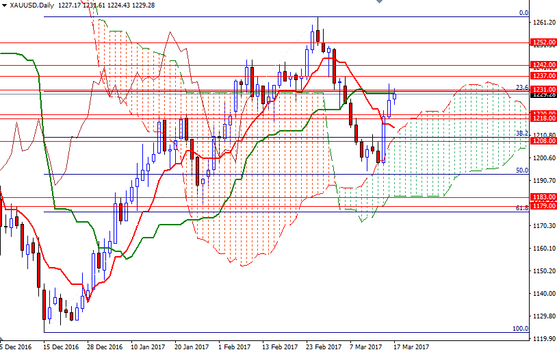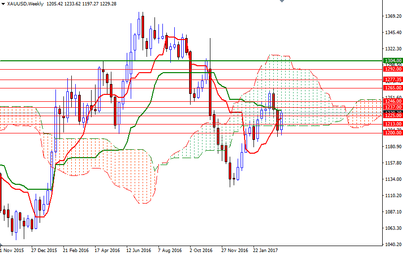 Last week’s strong bounce following the Fed's rate hike gave the bulls technical momentum they lacked previously, and pushed the XAU/USD pair above the Ichimoku clouds on the 4-hour time frame. Residing beyond both the daily and 4-hourly charts, along with the positive Tenkan-sen (nine-period moving average, red line) - Kijun-sen (twenty six-period moving average, green line) crosses, suggests that there is still more room to the upside. Although the bulls have momentum on their side, they have to overcome the nearby resistance in the 1234/1 area. If the bulls remain in control and the market can pass through this barrier, which also represents the 23.6% retracement of the bullish run from 1122.63 to 1263.84, look for further upside with 1238/7 and 1246/2 as targets. Beyond there the first solid resistance is located in the 1252/0 zone. Closing above 1252, at least on a daily basis, is essential for a bullish continuation towards 1265/1.