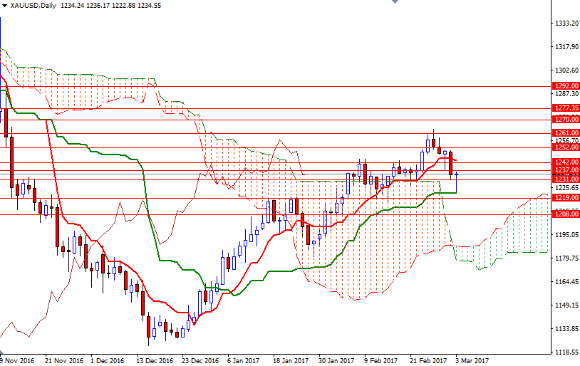 The February jobs report, which is scheduled to be released on March 10, could give the Federal Reserve the green light to raise rates this month. Just a week ago, after XAU/USD failed to penetrate the 1265/1 area, I had warned about the possibility of a pullback before gaining enough momentum to move towards the top of the weekly cloud. Trading above the Ichimoku clouds on the daily chart and positively aligned Tenkan-Sen (nine-period moving average, red line) - Kijun-Sen (twenty six-period moving average, green line) lines suggest that the market has a tendency to go higher over the medium-term. The long lower shadow of Friday’s candle also indicates that the expectations are somewhat factored into the market.