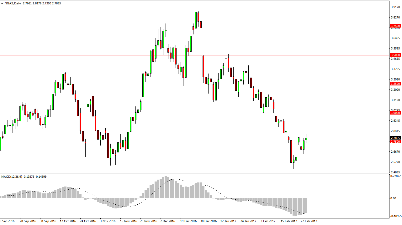 The natural gas markets had a slightly positive session on Wednesday, clearing the $2.75 level. While it isn’t necessarily a shooting star, it does suggest that were running out of steam to the upside, which of course would be expected. Ultimately, if we can break above the gap just above, the market will probably try to reach towards the $3 handle, which should be massively resistive, as it is a large, round, psychologically significant number, and of course has previously been supportive.