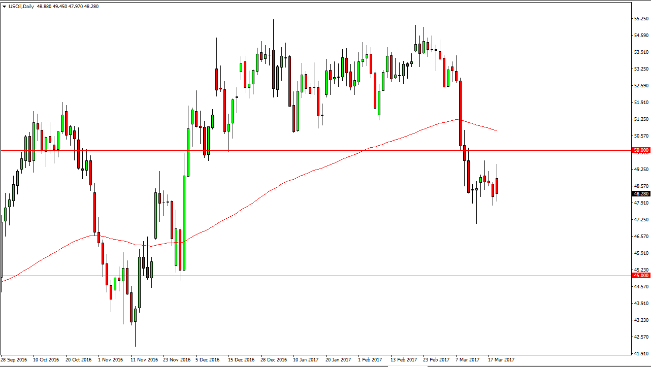 The WTI Crude Oil market initially tried to rally during the day on Tuesday, but the area just below the $50 level offered too much in the way of resistance for the markets to continue going higher. If we did break above there, that would be a bullish sign but I believe that the Crude Oil Inventories announcement coming out today will continue to be highly influential on this market, as we have seen so much in the way of oversupply recently. I believe that we will reach towards the $45 level underneath, which should be supportive. I believe rallies are selling opportunities and I have no interest in buying.