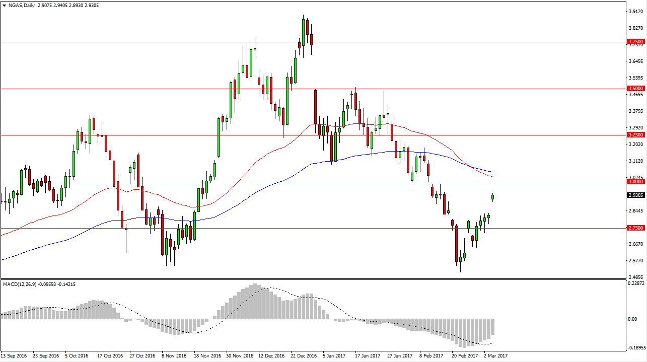 The natural gas markets gapped higher at the open on Monday, showing real signs of strength. I think that the $3 level above will continue to be massively resistive, and because of this I believe that the market will eventually form a negative candle, which of course I will start selling. The 50-day moving average, pictured in red on this chart, has recently crossed below the 100-day moving average which of course is a longer-term negative sign. I believe at that point we will reach towards the $2.75 level underneath, and then eventually the $2.50 level. Longer-term, I would not be surprised at all to see this market breakdown from there, and continue to go much lower.
