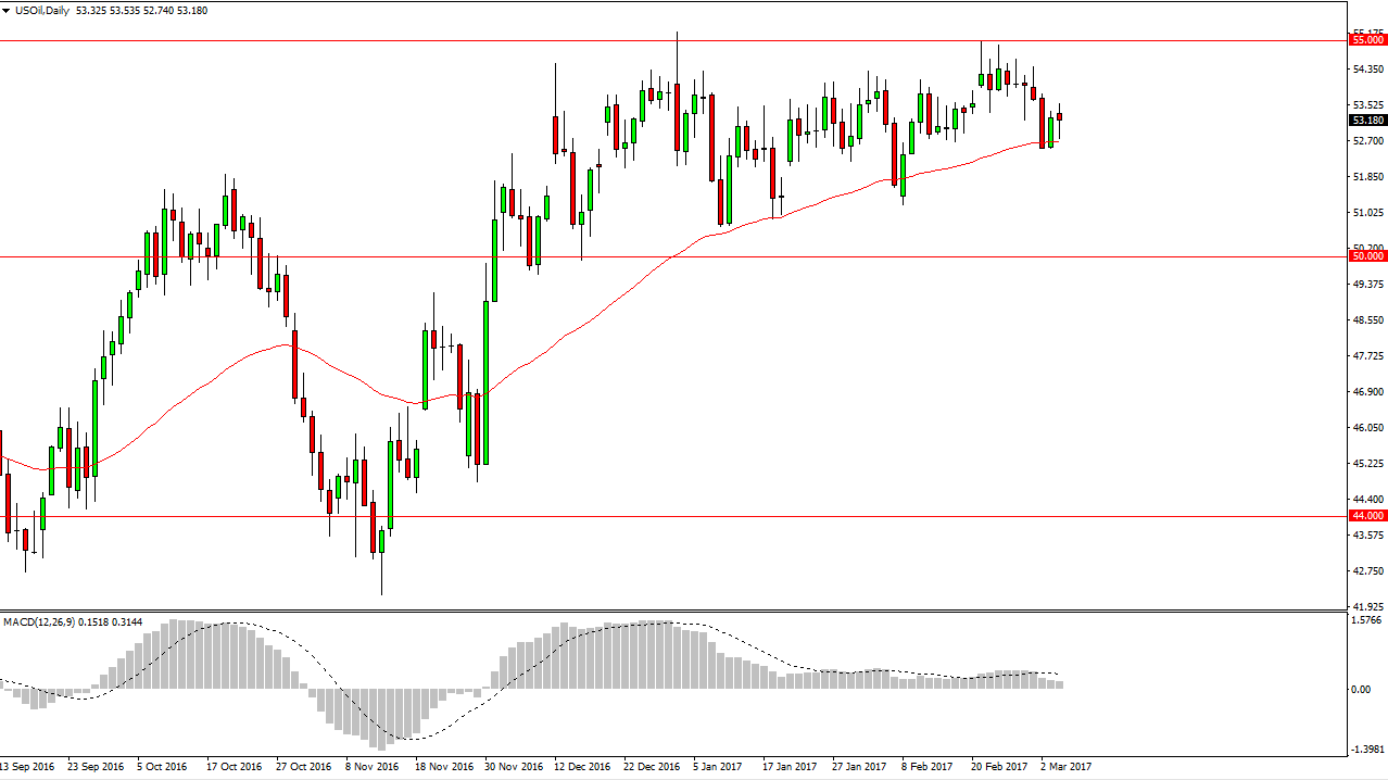 The WTI Crude Oil market initially fell on Monday, but found enough support at the 50-day exponential moving average to turn around and form a hammer. The hammer of course is a bullish sign, and the 50-day exponential moving average tends to attract a lot of attention. If we can break above the top of the candle, the market should then reach towards the $55 level. That is a level of considerable resistance is going to be difficult to break above, and once we do that could send this market towards the $60 level. A breakdown below the 50-day exponential moving average should send this market looking for the $51 level underneath. Regardless, expect a lot of choppiness as this market tends to be very difficult now, because quite frankly there is a lot of concern when it comes to oversupply, but at the same time there’s a lot of concern when it comes to OPEC production cuts.