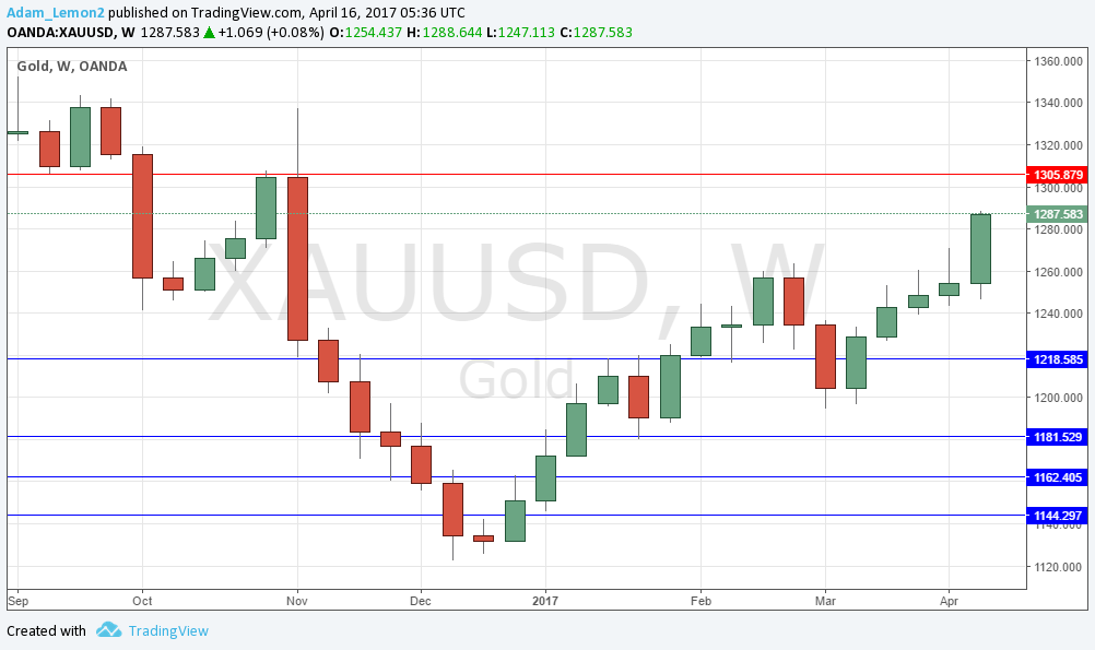 The weekly chart below shows that this currency cross is in a strong upwards trend, printing a strongly bullish candle which closed near its high. The price is also above its recent historical levels from both and 3 and 6 months. However, a possible factor standing in the way of a further large rise would be the key resistance level at $1305, which the price is now close to.