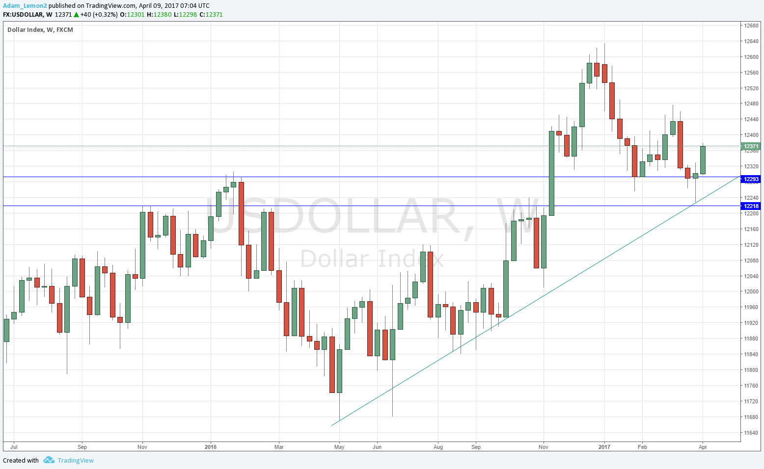 The U.S. Dollar printed a strongly bullish candle this week, closing hard on its high, with a long real body. A new bullish trend line can be drawn supporting the price over recent months, which is a bullish sign. The price is also clearly rejecting an area I had identified as supportive, shown by the blue lines in the chart below. The only contrary indication is that the price still below its level from 3 months back.