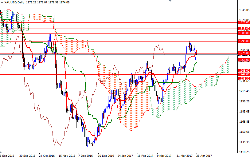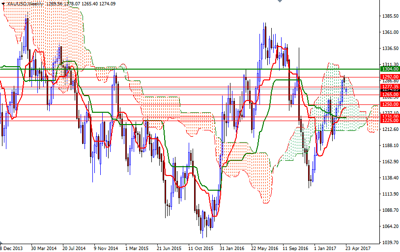 Yesterday’s gap dragged the XAU/USD pair into the Ichimoku clouds on the 4-hour time frame. The short-term charts are slightly bearish at the moment, with the market trading below the Ichimoku cloud on the H1 time frame. The market bounced off of the strategic support at 1265 but the bulls will need to push prices back above the 1285 level, which happens to be the top of the 4-hourly clouds, if they intend to tackle the 1289/8 zone. Penetrating 1289/8 could provide the bulls the extra fuel they need to reach the next barrier standing in the 1295/2 area.