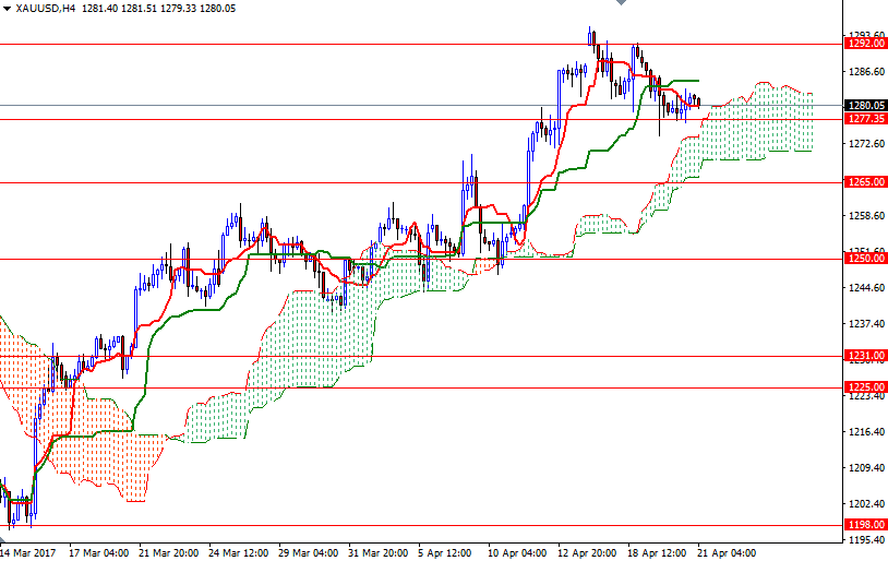 Gold prices ended slightly higher on Thursday but the trading range was relatively tight as investors took a cautious stance ahead of France’s closely watched presidential election. The XAU/USD pair swung between the $1283.35 and $1276.62 levels. The market is trading above the Ichimoku clouds on the daily and the 4-hourly charts, indicating that bulls have the overall medium-term technical advantage.