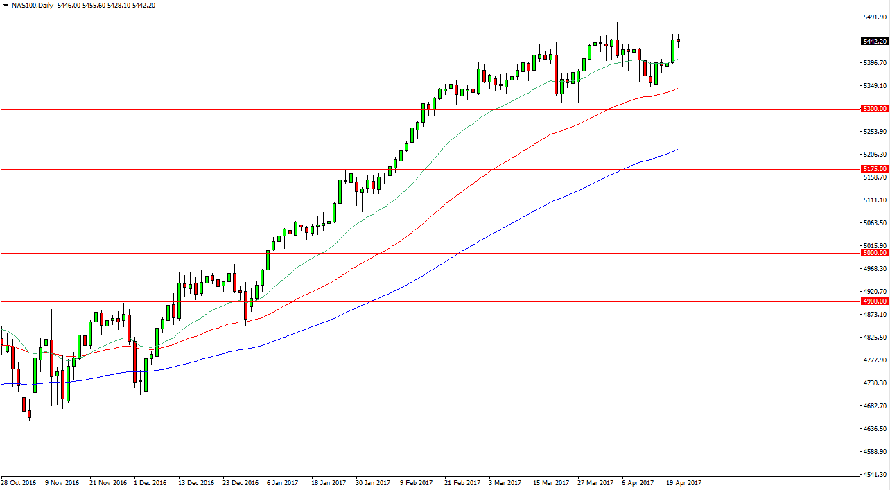 The NASDAQ 100 had a choppy session on Friday as well, as we continue to see buyers jumping to this market. The market looks as if it is ready to reach towards the 5500 level, which I think will eventually get above that level continue to go much higher. I think pullbacks continue to be buying opportunities, as the market has lead the rest of the indices around the world higher. The 50-day exponential moving average, pictured in red on the chart, continues to offer massive support as does the 20-day moving average, pictured in green. The 5300 level below is the absolute floor in the market, and I don’t see any chance of selling whatsoever as I believe longer-term drivers will continue to push the market higher.