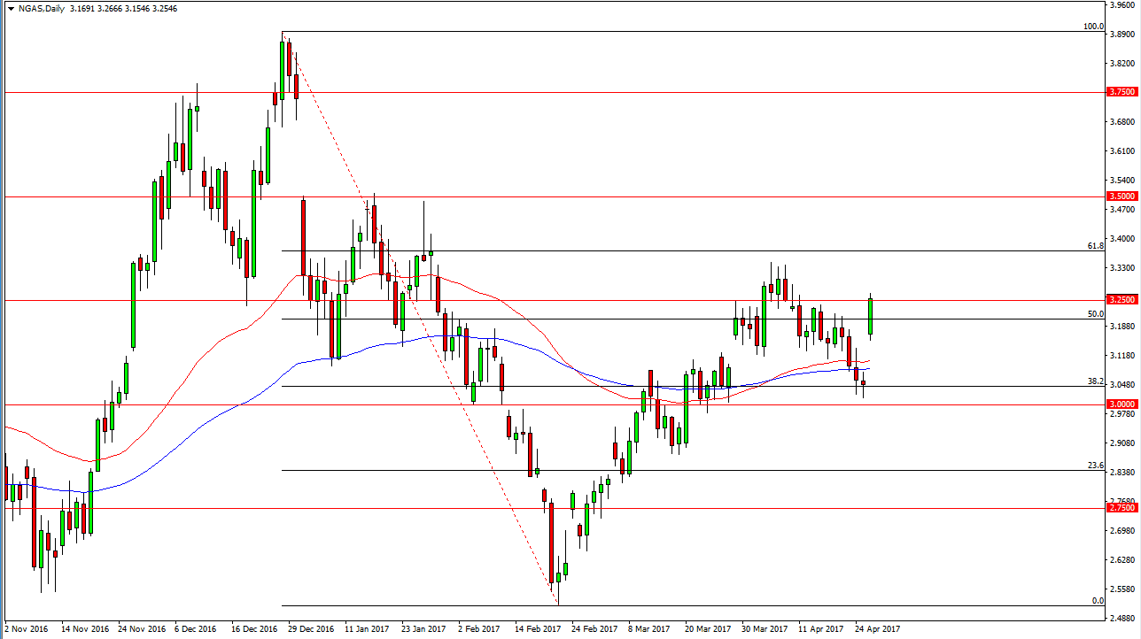 The natural gas markets gapped higher at the open, as we continue to see quite a bit of volatility in this market. The $3.25 level above has been tested as resistance, an area that’s been resistive in the past. If you are not involved in this market to the upside now, it’s very difficult to get involved here because you would simply be “chasing the trade.” Pullbacks that come back to fill the gap might be buying opportunities, just as a break to a fresh, new high would be. I don’t have any interest in trying to fight the move, I believe that this market is probably one that you should let calm down a little bit before putting any real money to work. It currently looks as if the natural gas markets are going to go higher, and at this point in time it’s going to be almost impossible to short this market.