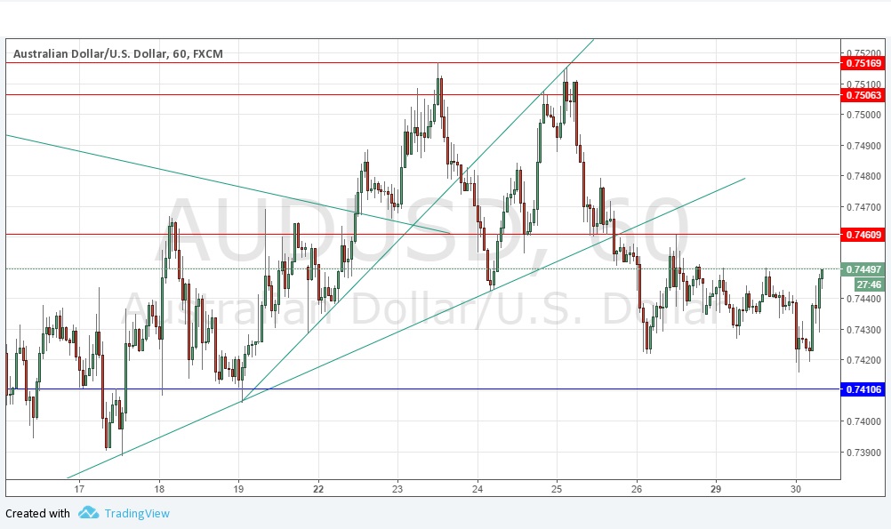 - Go long following some bullish price action on the H1 time frame immediately upon the next touch of 0.7411.