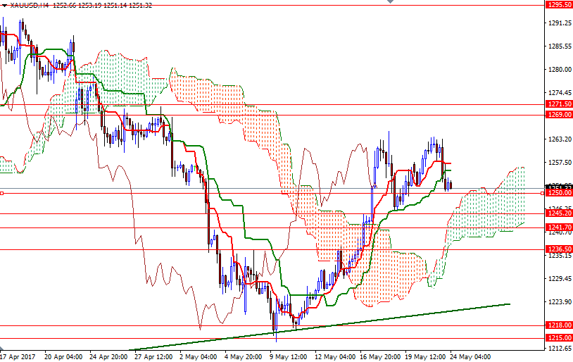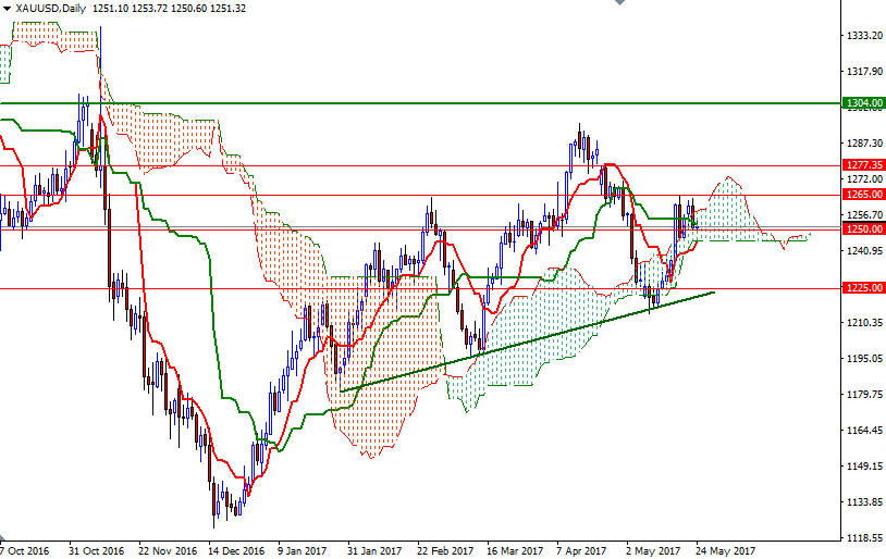 Gold prices fell $9.20 an ounce yesterday, erasing the gains made in the previous session, as the dollar strengthened and traders locked in profits ahead of the release of the minutes from the Federal Reserve’s May 2-3 policy meeting. Philadelphia Fed President Patrick Harker said "A slow first quarter isn’t something to ignore entirely, but weak first quarters have been a feature of the economy for the past several years. It’s essentially the norm now... based on the strong economic outlook, I continue to see three rate hikes for 2017 as appropriate." The market challenged the resistance in the $1265/1 area again but prices were not able to break through. As a result, XAU/USD retreated to the support in the $1252/0 zone, which looks in danger at the moment.