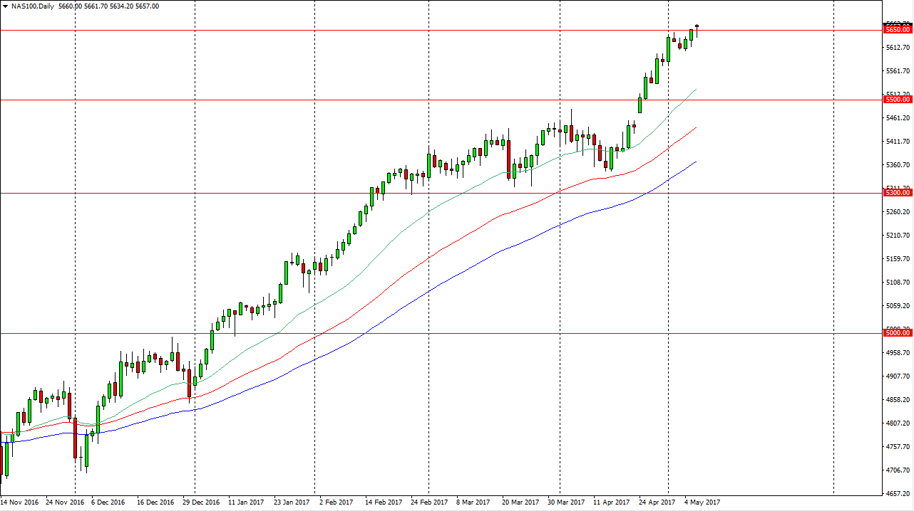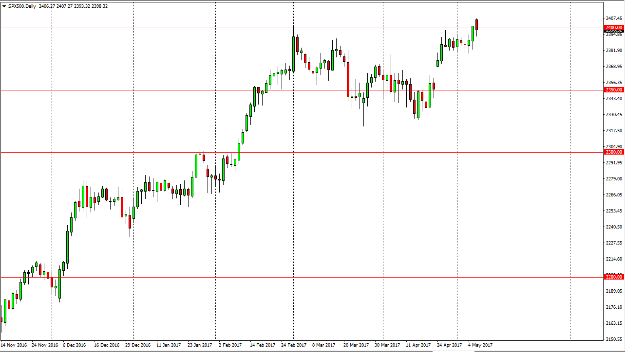The S&P 500 reacted positively to the French election results, gapping higher at the open. However, we fell significantly during the day but later in the New York trading session we found enough buyers to turn things around and form a relatively supportive looking candle. Because of this, I believe that the S&P 500 is still going to continue to grind to the upside, as money flows back into the stock markets. There seems to be a significant amount of support at the 2380 handle, so it’s not until we break down below there that I would consider selling. Even then, I would be very cautious about doing so. I much prefer the uptrend of that we have seen for some time. Because of this, I believe that the buyers are simply looking at these pullbacks as value.