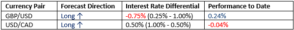 This month we forecasted that the highest-probability trades would be long GBP/USD and USD/CAD. The overall performance to date has been slightly positive: