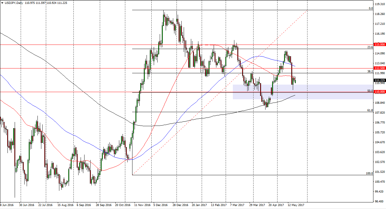 The USD/JPY pair initially tried to rally on Monday, but turned around to fall significantly. We bounce from there, and the 111 level has offered support. That is the beginning of a support zone that is centered around the 110 handle and of course the 50% Fibonacci retracement level from the previous move higher. The 200 day exponential moving average is just below, and it should continue to offer buying opportunities. If we can break above the 112.50 level, the market should then go to the 115 handle. If we break down below the 110 level underneath, then the market will probably go to the lows again which consequently happen to be the 61.8% Fibonacci retracement level at the 108 handle. Keep in mind that the pair is highly sensitive to risk appetite in general.