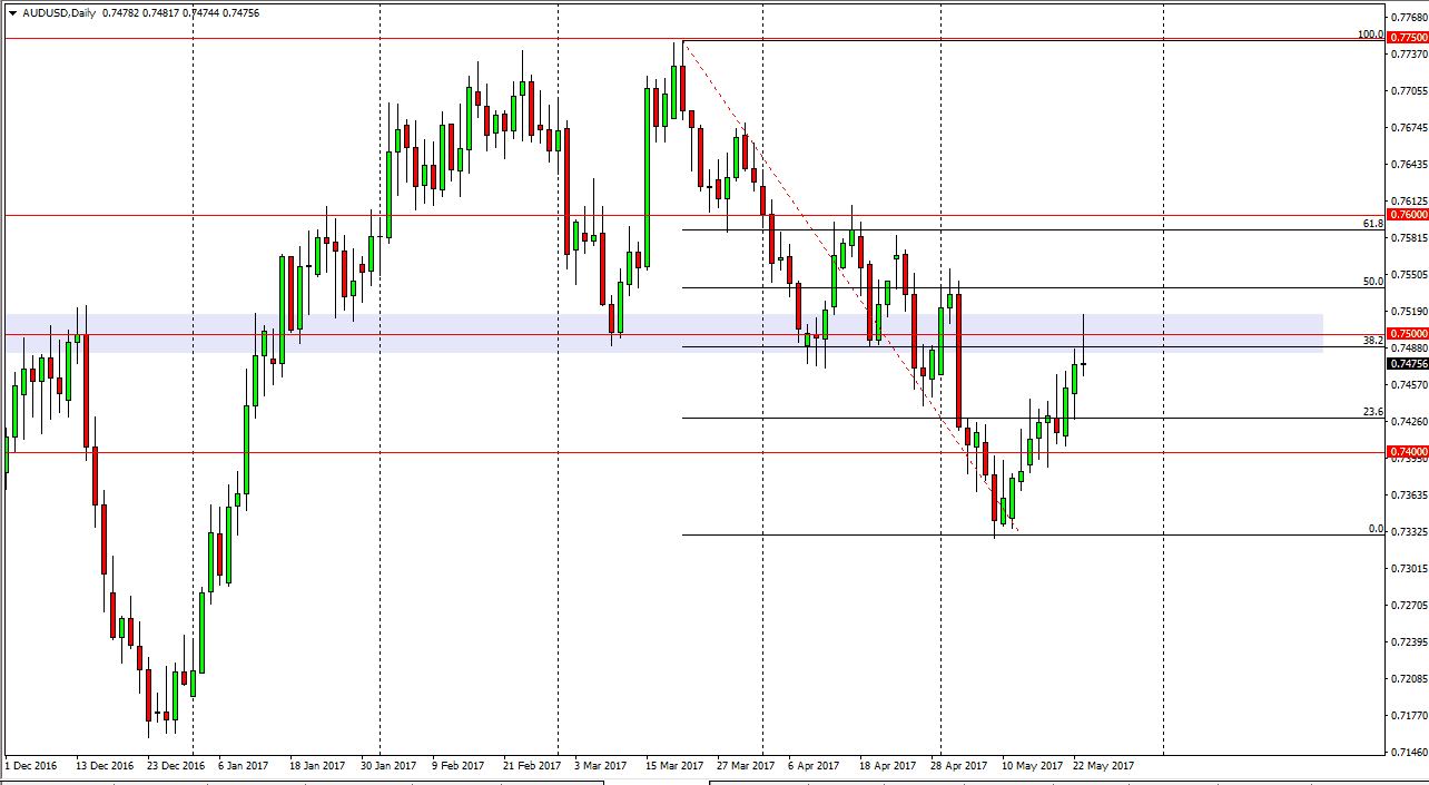 The Australian dollar tried to rally during the day on Tuesday but found the area above the 0.75 level to be far too exhaustive and resistive to continue going higher. We formed a perfect shooting star and therefore breakdown below the bottom of the range for the day is a cell signal. This could send the market down to the 0.7332 level rather quickly, and possibly even lower than that. This is a perfect retracement to the 38.2% Fibonacci retracement level as well, so I think that a lot of people will be looking at this area. Pay attention gold, because of it breaks down, that will only add more fuel to the fire in this pair, and the fact that the USD/JPY pair is rising could also show signs of the market running back into the US dollar as it has gotten a bit oversold as of late. If that’s the case, the Aussie is going to continue to be punished. Alternately, if we can break above the top of the range for Tuesday, that’s a very good sign and we should continue higher.