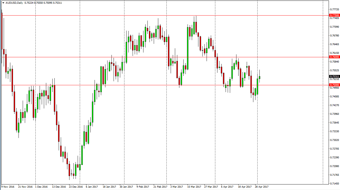 The Australian dollar rallied as well, but then turned around to form a shooting star also. I believe that if we break down below the 0.75 level, the Australian dollar will drift even lower it is not lost upon me that the Australian dollar is very risk sensitive as well, and it is telling me the same thing as the USD/JPY pair. Because of this, I think that we could see some selling come into the marketplace but I also recognize that a break above the top of the shooting star would be bullish and probably have this market looking for the 0.76 level next. I believe that there is plenty of support below to keep this market from falling apart, and would expect a move lower to probably find support near the 0.74 handle. I think we are currently seeing a slow grind lower in the Australian dollar, and that may continue going forward as we simply drift with a slightly negative bias.