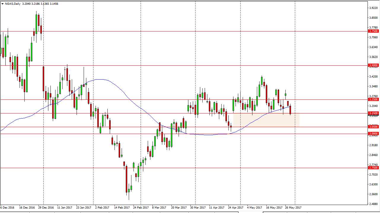 Natural gas markets fell during the day on Tuesday, testing the $3.15 level. A break below the $3.14 level underneath would send this market looking to fill the gap below, which has the market then reaching towards the $3.05 level. A breakdown below there has the market and looking for the $3 level. Ultimately, today will be interesting because if we bounce from here, then we go to the $3.25 level. Either way, we should have plenty of movement, and today should make for good trading, once we decide which direction to go. Short-term traders love these types of setups, because it’s a binary situation, we either buy or sell, and the market will make it obvious as to where we go next, lease for the next several hours. If we were to break above the $3.25 level, we should continue to see buyers getting involved to press this market towards the $3.33 level above. Either way, I think you can expect good trading conditions.