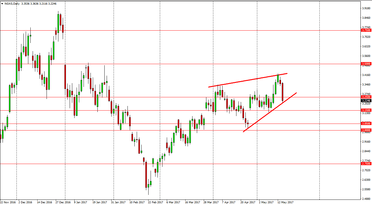 Natural gas markets have fallen rather significantly during the day, slicing through the $3.25 level. As you can see on the chart, I have drawn a rising wedge, which is typically a very negative sign if he gets triggered to the downside. I think if we can break down below the $3.15 level, that will be very negative and the market should then go down to the 3.05 level, which has been the beginning of the gap lately and will more than likely be very attractive to the sellers. Alternately, if we break above the $3.25 level, then the market should continue to go higher. I believe that today could be a very important day, and therefore it’s likely that the market will continue to see quite a bit of volatility, but if we get an impulsive move, I’m willing to follow it. Expect a lot of choppiness, but that will lend itself to trading CFDs, and not futures markets as the market can get very expensive very quickly if you are wrong.