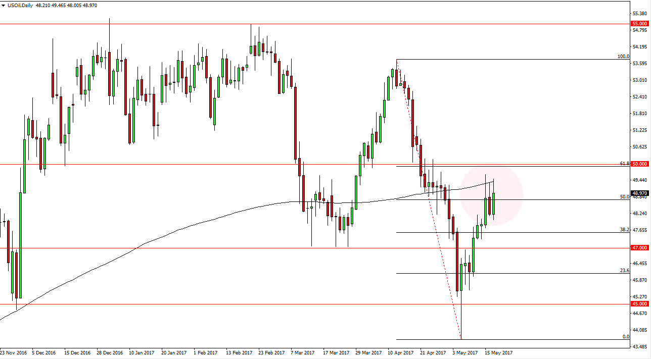 The oil markets rallied during the session on Wednesday, as we tested the 200-exponential moving average yet again. We got bullish inventory numbers, but you can see that we got a bit of pushback at that area, so having said that it’s likely that we will continue to struggle. At this point, I need to see the market close on a daily chart above the $50 level to feel comfortable buying. That’s not to say that I think we’re going to fall apart here, I just think that the market is looking a little bit strange in this area, as you would think the numbers today could have pushed things much higher. If we break the bottom of the range for the day on Wednesday, then I think the market goes looking to the $47 level for support.
