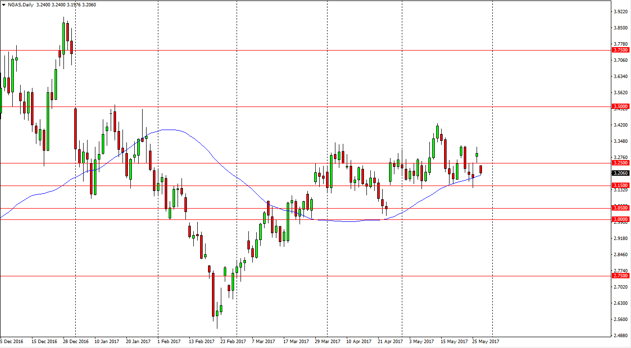 The natural gas markets gapped lower during the day on Monday, but having said that it’s also worth pointing out that Monday was Memorial Day. That would have less liquidity in the market, so therefore the move may have been a little bit exaggerated. Ultimately, I believe that the $3.15 level underneath is massively supportive, and I believe that the market will probably struggle to go lower than there. However, if it does the market should continue to go down to the $3.05 level. Alternately, if we bounce from this area, I believe the market will then send this market looking towards the $3.25 level above. Regardless, expect volatility and therefore small positions will be the best way to go in this market. I think there is still a little bit of an upward bias, but clearly, we don’t have a whole lot to go on right now.